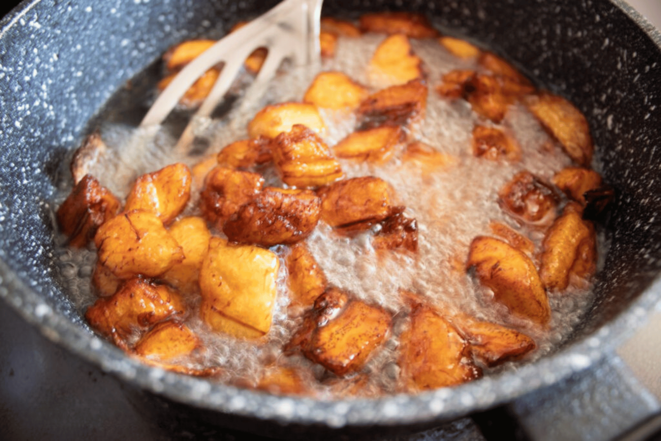 No batter. No extra steps. The natural sugars in the plantains caramelize during frying. That is what makes them so good.