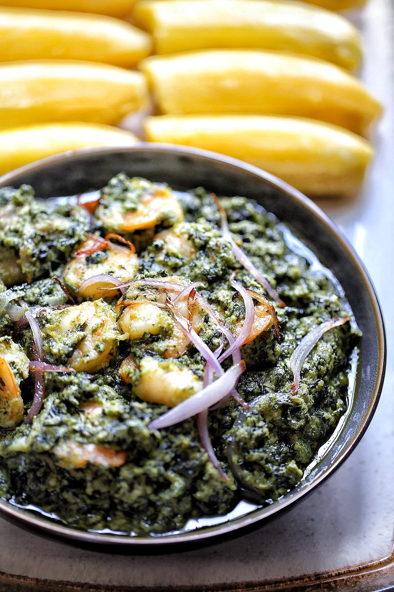 Ndolé gets its unique bitter-sweet taste from ndoleh leaves and ground peanuts. It is richer and often includes seafood or meat.