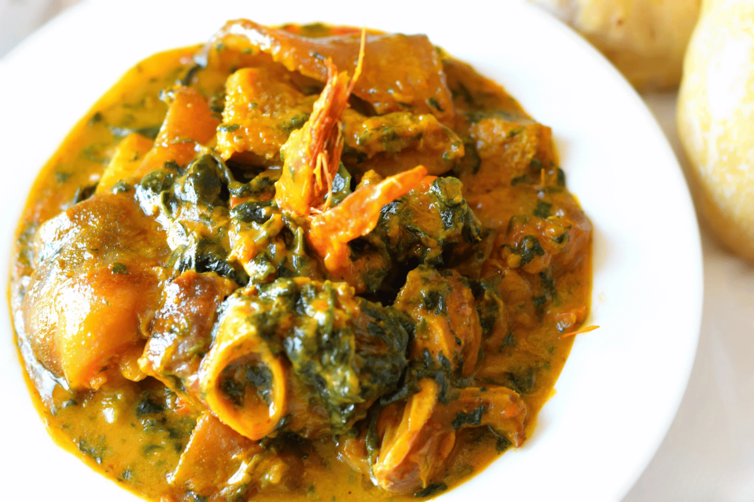 The soup blends palm oil richness, fermented flavors from ogiri, and spices. Cocoyam adds body without heaviness.