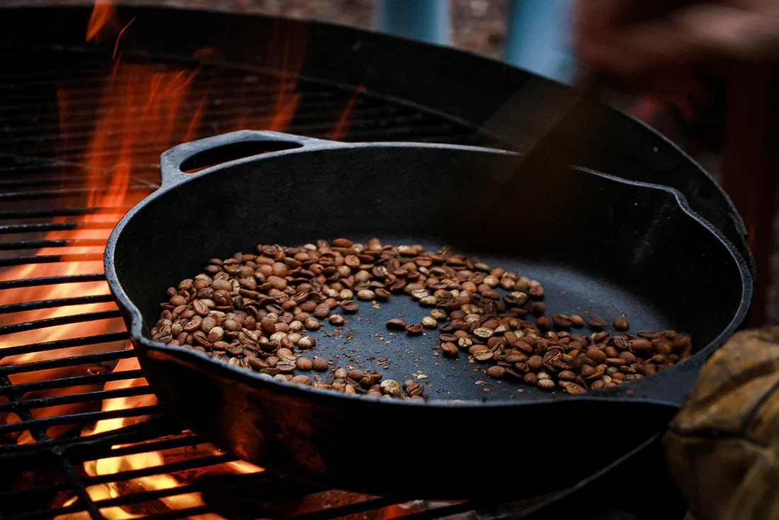 The raw green beans are poured into a flat pan and roasted over charcoal. Slowly, the beans turn from pale green to deep brown. The smell is heavenly: bold, earthy, and ancient.